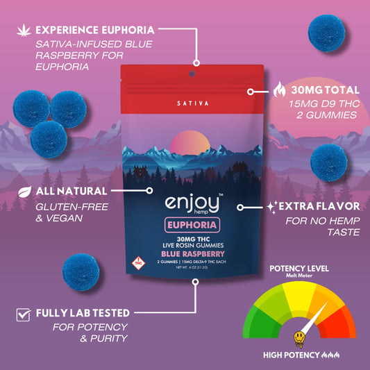 Enjoy Hemp | Sativa | Euphoria | 2ct. 15mg per piece Delta 9 THC Live Rosin Gummies | 30mg per package | Blue Raspberry